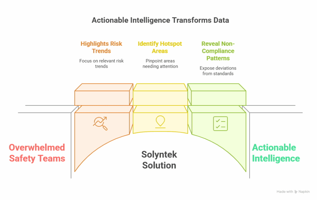 Solyntek’s AI algorithms identify risk patterns by analyzing the collected data. This predictive capability enables safety managers to take proactive measures to address potential incidents before they escalate. By targeting the root causes of incidents, organizations can enact corrective actions that significantly reduce the chances of recurrence.