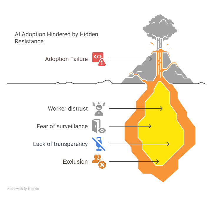 When workers don’t understand or trust AI tools, adoption suffers. Resistance often stems from fear of surveillance.
